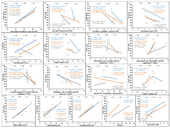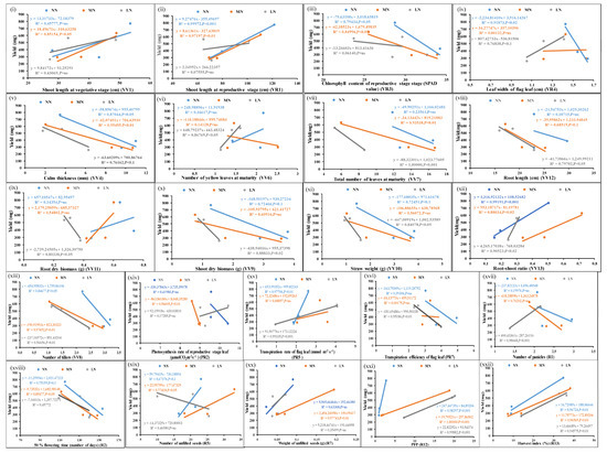 Scatter plots showing significant correlations of yield with N-responsive parameters. Correlations of the mean values of each of the parameters, (i–xxii) from three genotypes at normal, medium, and low doses of N with corresponding yield values at p-values of <0.01, 0.02, 0.05, and 0.001 showing significant correlations; p-value of <0.1 means less significant correlation, ns means non-significant correlation.