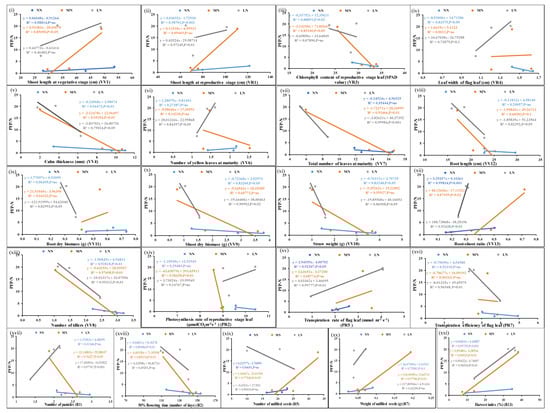Scatter plots showing significant correlations of PFP-N with N-responsive parameters. Correlations of the mean values of each of the parameters, (i–xxi) from three genotypes at normal, medium, and low doses of N with corresponding PFP values at p-values of <0.01, 0.02, 0.05, and 0.001 showing significant correlations; p-value of <0.1 means less significant correlation, ns means non-significant correlation.