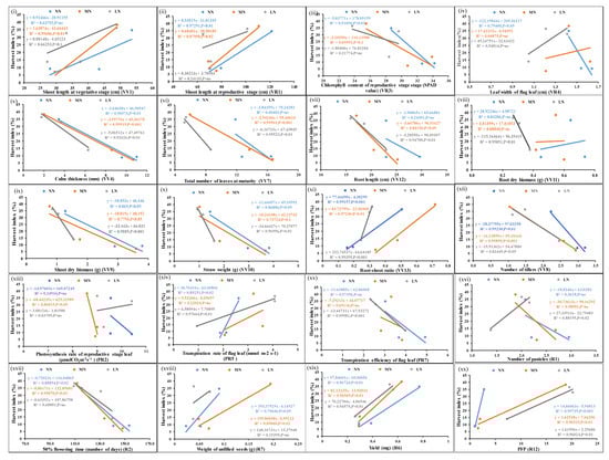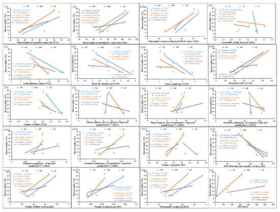 Scatter plots showing significant correlations of HI with N-responsive parameters. Correlations of the mean values of each of the parameters, (i–xx) from three genotypes at normal, medium, and low doses of N with corresponding HI values at p-values of <0.01, 0.02, 0.05, and 0.001 showing significant correlations; p-value of <0.1 means less significant correlation, ns means non-significant correlation.