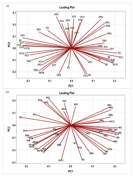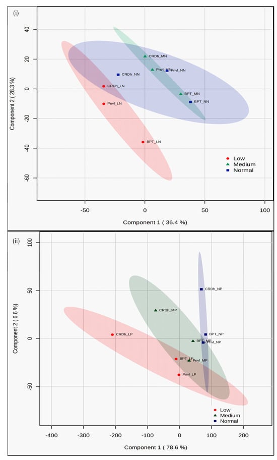 Loading plots of first two principal components of N-response (i) and P-response (ii). PCA was performed using the data of all parameters at all doses of N and P combined, plotted using Minitab v21.4.2 statistical software.