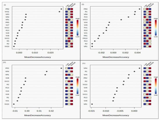 Feature selection analyses using RandomForest package (Metaboanalyst 6.0 software) enabled the ranking of the 21 parameters listed in Table 1 for NUE (Supplementary Table S12). A similar ranking was performed for the 22 parameters listed in Table 2 for PUE (Supplementary Table S13) and 12 common to both NUE and PUE (Supplementary Table S14). VIPs of these ranked parameters are shown in Figure 9. A comparison of such ranking analysis using other tools such as Weka 3 and VIP score revealed some differences in their ranking pattern. Therefore, Venn selection was used to identify the parameters common to the top half of the rankings by each of the three tools for NUE and PUE and common to both. For NUE, these highly ranked parameters were leaf chlorophyll content, the photosynthetic rate at the reproductive stage, root length, total number of leaves at maturity, and HI. For PUE, these high-ranking parameters were the number of panicles, shoot dry biomass, culm thickness, shoot length, and the photosynthetic rate at the vegetative stage. More importantly, this exercise revealed the common high-ranking parameters for NUE and PUE, which were the photosynthetic rate at the reproductive stage, number of tillers, root–shoot ratio, culm thickness, leaf width of flag leaf, shoot biomass, and straw weight.