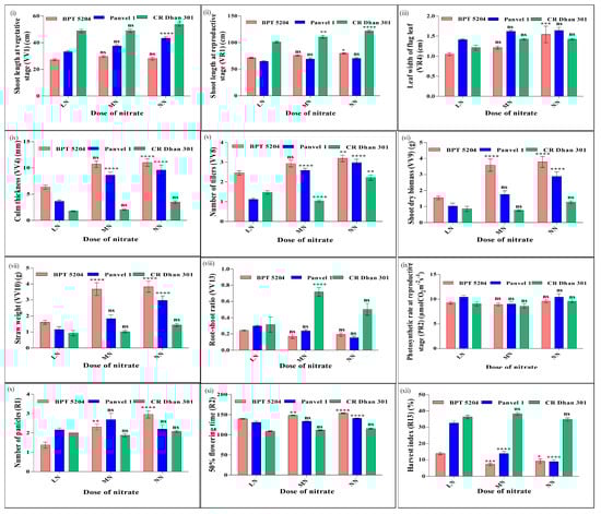 The effect of N doses on these 12 common nutrient-use efficiency parameters are shown in Figure 10. It showed that there was a positive effect of increasing the N dose on the shoot length at the vegetative and reproductive stages. The effect was clearly visible in CR Dhan 301 at both stages and at the vegetative stage in Panvel 1. BPT 5204 and Panvel 1 showed a smaller increase in shoot length at medium or normal N as compared to low N. At the reproductive stage, the increase in shoot length was higher in BPT 5204 than in Panvel 1. Among the three genotypes, CR Dhan 301 had the highest shoot length followed by BPT 5204 and Panvel 1 at all N doses. The leaf width of the flag leaf increased with an increase in the N dose, except in CR Dhan 301 at the medium N dose. The dose-wise N-response was clearly visible in BPT 5204. The increase in leaf width from medium to normal N was much higher than from low to medium N, indicating the importance of genotypic differences in leaf width with increasing N. Among the three genotypes, Panvel 1 had the highest leaf width of flag leaf followed by CR Dhan 301 and BPT 5204 at all N doses.