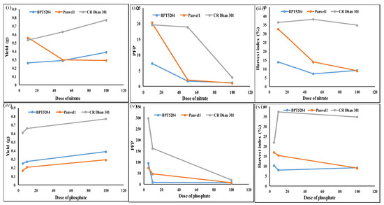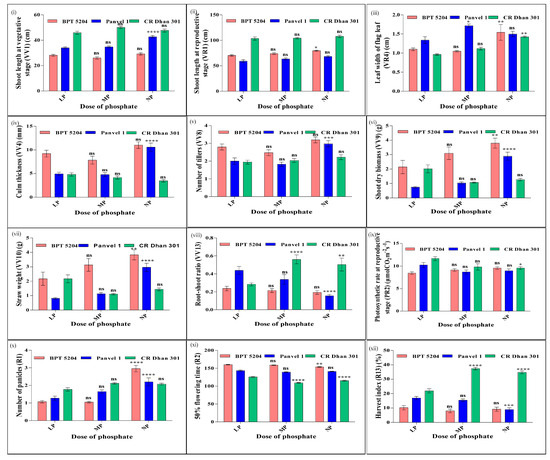 Similarly, the effect of P doses on these 12 common nutrient-use efficiency parameters are shown in Figure 11 and it showed that there was a small positive effect of increasing the P dose on shoot length at the vegetative and reproductive stages. The effect was most prominent in Panvel 1 at the vegetative stage and to a lesser extent in BPT 5204 at the reproductive stage. Among the three genotypes, CR Dhan 301 had the highest shoot length followed by BPT 5204 and Panvel 1 at all P doses. The leaf width of the flag leaf increased with an increase in the P dose, except in BPT 5204 at a low P dose and in Panvel 1 at a normal P dose. The dose–response pattern in leaf width was more prominent from medium to normal doses in CR Dhan 301 and BPT 5204 than from low to medium doses, whereas in Panvel 1, leaf width peaked from low to medium doses and declined thereafter. These differences between the nutrient responses of different associated parameters in terms of genotypes/stages/doses could be of significant interest for crop improvement.