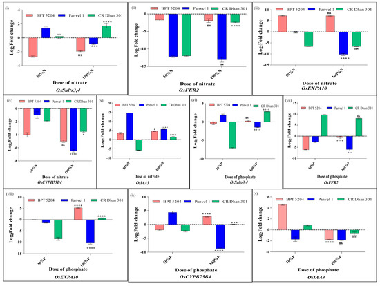 A Venn selection was carried out using 389 NUE-related candidate genes [22] and 103 PUE-MQTL-associated genes [45] in rice using the Venny 2.1 tool. This revealed five common genes for NUE and PUE. Their differential gene expression at each of the three N/P doses was examined by qRT-PCR in all three genotypes, using the primers provided in Supplementary Table S15 and actin as an internal housekeeping control.