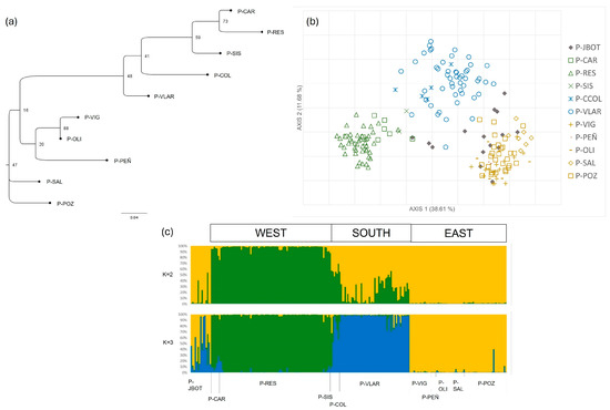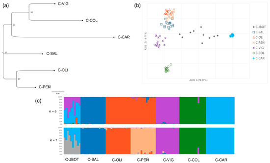 The results to infer the genetic relationship between populations, such as the Neighbor-joining dendrogram (Figure 2a) and the PCoA (Figure 2b), showed a clear differentiation of C-CAR with respect to the other populations. The first two axes of the PCoA accounted for a high proportion of the total variance (49.08%). Nonetheless, in the PCoA, C-VIG, and C-COL were also quite differentiated, while C-SAL, PEÑ, and OLI are related. All the individuals were grouped according to the geographic origins of the samples. The individuals from the Botanical Garden (C-JBOT) appear between the population “Montaña Cardón” (C-CAR) and the rest (Figure 2c).