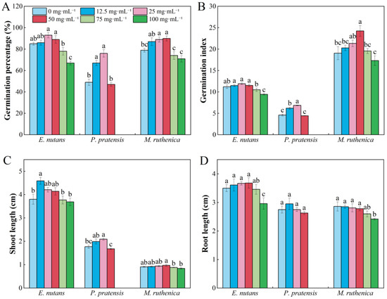 The five standard samples of allelopathic substances were configured into solutions with concentrations of 0.25, 0.5, 0.75, and 1 mg·mL−1, respectively. Then, 30 surface-sterilized seeds of E. nutans, P. pratensis, and M. ruthenica were placed in Petri dishes with a diameter of 9 cm and two layers of filter paper, respectively. Five milliliters of each compound and concentration of allelopathic solution or distilled water were added to dishes, and each treatment was replicated 3 times for a total of 189 dishes (5 compounds × 4 concentrations × 3 tested seeds × 3 replicates + 3 distilled water replicates × 3 tested seeds). Then, the Petri dishes were placed in an incubator with pre-set parameters; seedling and root lengths were determined on the tenth day of germination, and GP, GI, and RI were calculated according to the following Equations (1)–(3) [37,49,50]: