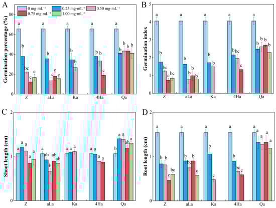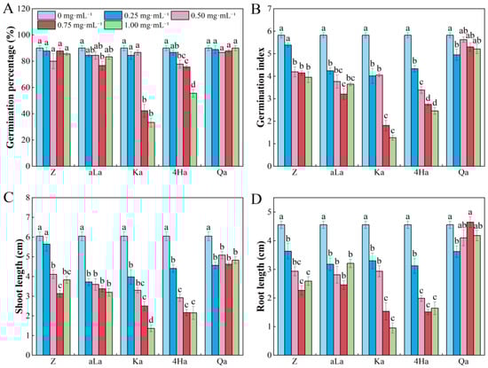 Effects of different concentrations of five compounds from Rhododendron capitatum foliage litter on seed germination (A,B) and seedling growth (C,D) of Medicago ruthenica. Different lowercase letters above the bars indicate significant differences (p < 0.05) among concentrations under the same compound. Z represents Zanamivir; aLa represents alpha-linolenic acid; Ka represents Kaurenoic acid; 4Ha represents 4-Hydroxyphenylglycolic acid; Qa represents Quinic acid. Values represent means ± SE.