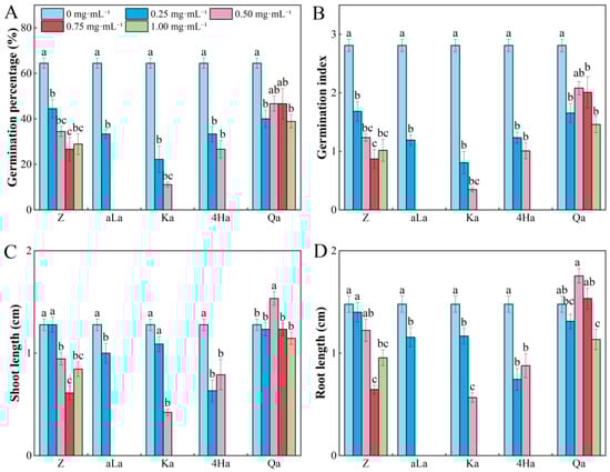 Effects of different concentrations of five compounds from Rhododendron capitatum foliage litter on seed germination (A,B) and seedling growth (C,D) of Elymus nutans. Different lowercase letters above the bars indicate significant differences (p < 0.05) among concentrations under the same compound. Z represents Zanamivir; aLa represents alpha-linolenic acid; Ka represents Kaurenoic acid; 4Ha represents 4-Hydroxyphenylglycolic acid; Qa represents Quinic acid. Values represent means ± SE.