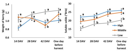 Figure 1. Evolution of berry weight and soluble solids in Cabernet Sauvignon samples from high-, middle-, and low-quality plots throughout ripening. Graph points corresponded to the means of the determinations obtained in each date that are shown with their standard deviation. In this, the means followed by the same lower-case letter in the same date do not differ statistically.
