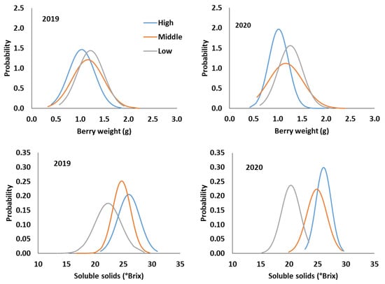 Figure 2. Normal distribution of berry weight (g) and berry-soluble solids (°Brix) obtained from Cabernet Sauvignon samples plots with high-, middle-, and low-quality potential in 2019 and 2020 seasons.