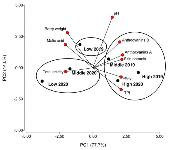 To classify the different samples, principal component analysis (PCA) was performed using the physicochemical parameters at harvest from berries collected from the studied Cabernet Sauvignon plots (Figure 3). PC1 and PC2 represented 77.7 and 14.0% of the total variance, respectively, representing 91.7% of all the variance. PC1 was strongly correlated (r2 > 0.9) to the soluble solids (+), extractable anthocyanins (+), skin phenols (+), and total polyphenol index (+), whereas none of the variables were strongly correlated to PC2. Berry data from high-quality plots in both seasons were located on the opposite side of berry data from low-quality plots, whereas the rest of the treatments were placed in the middle side on PC1.