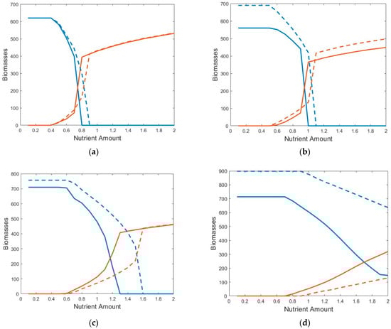 Table 1 shows only the three qualitative states of competition between FAV and SAV. The quantitative values of biomasses are given in the bifurcation diagrams in Figure 1. The lines represent averages over both the whole spatial lattice as well as over the period of time after which the system reached a final state. Here, temperature scenarios 1 through 4 are shown. The mean temperature decreases and seasonal fluctuations increase when moving from panels (a) to (d). As the mean temperature decreases, the range of coexistence (where the red and blue lines overlap) shifts to the right (i.e., higher nutrient levels), and the final mean value of the FAV biomass substantially decreases. In these plots, the solid lines represent the biomasses of FAV (red) and SAV (blue) for simulations in which seasonal temperature fluctuations are included, while the dashed lines represent simulations where only the mean annual temperature was included.