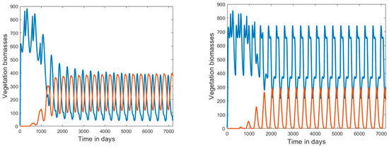 The bifurcation diagrams show the biomasses averaged over both space and time. There is temporal variability of the biomasses, as shown in Figure 2 for two temperature scenarios in which coexistence occurred, namely, temperature scenarios 3 and 6. The cooler part of the season favored SAV, while the warmer favored FAV; thus, seasonal fluctuations occurred for the two species that were 180 degrees out of phase.