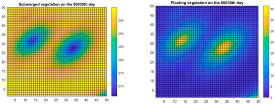 The model developed by [53] is spatially implicit. McCann (2016) [55] further developed this model into a spatial CA model composed of a grid of spatial pixels that could form two-dimensional areas of different shapes. We used a spatially explicit model, as it allowed us to initiate the development of two species in a variety of ways spatially, which could have made a difference in the outcomes yielded by the model. By dispersing propagules of each species in a random fashion across the spatial grid, the simulations provided a better chance of ensuring the competition did not depend too heavily on the starting biomasses, as might be the case in a spatially implicit model. It was assumed that SAV and FAV could spread among the pixels and that the limiting nutrient in the water column could diffuse. The edges of the spatial grid were reflective so that vegetation and the limiting nutrient did not spread out from the gridded system. We adapted the two-dimensional spatial model developed by [55] for the special case of a 50 × 50-pixel grid, with each pixel being 1 m × 1 m. This scale of resolution is the same as that employed by [55] and about the spatial scale of a few full-grown water hyacinth plants. Our model is not strictly a CA model, as continuous levels of biomasses of both species could occupy individual spatial cells.