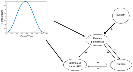 Although the FAV in our model, P. crassipes, can generally be limited by either nitrogen or phosphorus, experiments conducted at the U.S. Department of Agriculture’s Invasive Plant Research Laboratory in Davie, Florida, show that P. crassipes growth responds strongly to nitrogen, which we assume is the limiting factor in the model. We follow Scheffer et al. (2003) [53] in assuming that SAV is light-limited. Figure 4 shows a schematic of the relationships. The inset represents the effect of temperature on the two species.