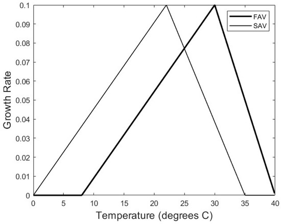Growth rate vs. temperature for floating (FAV) and submersed (SAV) macrophytes. FAV triangle is based on Figure 5 of Wilson et al. (2005) [57], while SAV is assumed to correspond to a temperate species similar to Nuttall’s waterweed with a lower temperature growth optimum.
