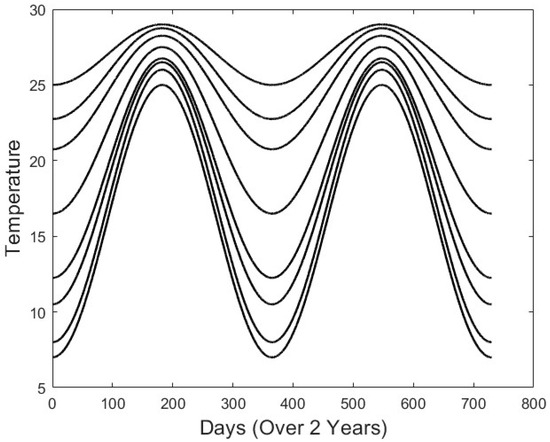 Eight temperature scenarios used in the simulations. The mean temperatures and amplitudes are given in Table 2. The extreme upper and lower curves were estimated based on graphs based on a Google search of ‘Climate in Miami, Florida’ and ‘Climate of Birmingham, Alabama’. The curves were fit based on averages of monthly highs and lows. The curves between the extremes were found to exhibit an arbitrary series of values of means and the amplitudes of the temperatures between those.