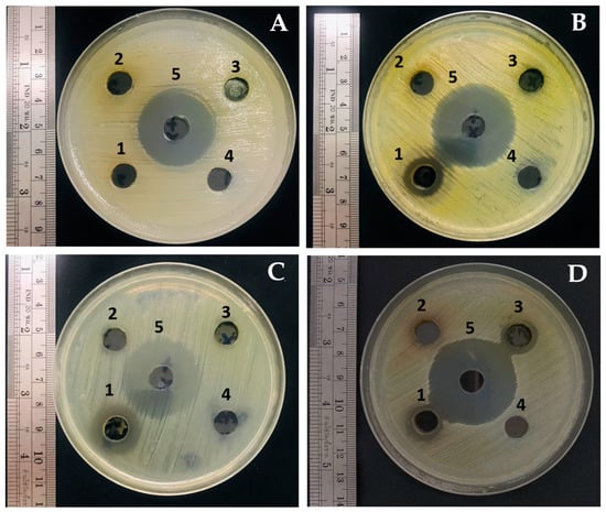 Effect of plant extracts from the Acanthaceae family against some oral pathogenic bacteria (A) K. pneumoniae, (B) S. aureus, (C) S. mutans, and (D) S. pyogenes by agar well diffusion method. Wells were loaded with the following treatments: (1) T. laurifolia, (2) A. ebracteatus, (3) C. nutans, (4) negative controls (DMSO 99.9%), and (5) positive controls (gentamicin 1 mg/mL).