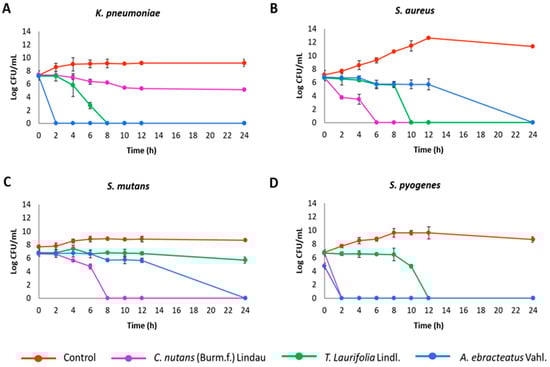 Effect of plant extracts from the Acanthaceae family (1 MIC) against (A) K. pneumoniae, (B) S. aureus, (C) S. mutans, and (D) S. pyogenes. Time–kill data represented as mean ± SD (n = 3).