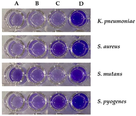 Effect of plant extracts from the Acanthaceae family on the biofilm formation of oral pathogenic bacteria: K. pneumoniae, S. aureus, S. mutans, and S. pyogenes after treatment with (A) C. nutans, (B) T. laurifolia, (C) A. ebracteatus, and (D) bacterial control group, which was not treated with the extracts.