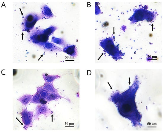The cells were cultured on microscope cover glasses within 24-well plates at a density of 1 × 104 cells/mL and incubated at 37 °C in a 5% CO2 incubator for 24 h. Subsequently, the media were removed, and the cells were infected with 200 µL of bacterial suspension of S. mutans, which was adjusted to 1 × 108 CFU/mL and treated with 200 µL of plant extracts. After incubation for 3 h, the supernatants were removed, and the cells were washed 2–3 times with 1X PBS (pH 7.4). The cells were then fixed with methanol for 5 min and stained with 0.38% Giemsa for 15 min []. After excess stain removal, the microscope cover glasses were investigated under a light microscope (OLYMPUS CX31, Center Valley, PA, USA). The percentage of antibacterial adhesion was calculated by counting the number of cells to which bacteria had adhered and compared to the negative control using the following formula: