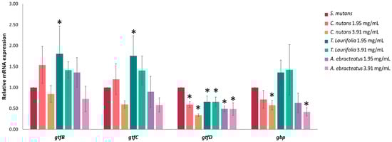 S. mutans produces glucosyltransferases (GTFs) to create glucans, which facilitate bacterial adhesion and biofilm formation by binding to the interface between bacteria and the surface. The mRNA expression of glucosyltransferases (gtf) and glucan-binding protein (gbp) genes was studied by real-time qPCR. The results showed that the effect of C. nutans, T. laurifolia, and A. ebracteatus extracts at concentrations of 1.95 and 3.91 mg/mL could significantly downregulate the gtfD gene when compared to the bacterial control group that was not treated with the extracts. Moreover, the extracts of C. nutans and A. ebracteatus at a concentration of 3.91 mg/mL significantly suppressed the mRNA expression of gbp and also inhibited the mRNA expression of the gtfB and gtfC gene without significant differences compared to the bacterial control group that was not treated with extracts. However, the extracts of T. laurifolia did not downregulate the mRNA expression levels gtfB and gtfC (p < 0.05) in the same conditions (Figure 5).