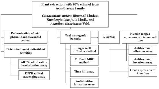 Therefore, we have evaluated the compounds and antioxidant activity of plant extracts from the Acanthaceae family, focusing on Clinacanthus nutans (Burm.f.) Lindau, Thunbergia laurifolia Lindl., and Acanthus ebracteatus Vahl. in this study. Antibacterial activities against oral pathogenic bacteria, including Streptococcus pyogenes, Streptococcus mutans, Staphylococcus aureus, and Klebsiella pneumoniae, were investigated. Moreover, the abilities of these plant extracts to inhibit bacterial growth, prevent biofilm formation, and affect bacterial adhesion and invasion on oral squamous cells were examined. Additionally, the regulations of virulence genes in S. mutans that contributed to biofilm formation and bacterial adhesion were examined.