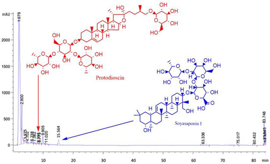 The bioconversion process by Y. lipolytica P01a was carried out at different initial concentrations of diosgenin, which varied from 10 to 1000 mg L−1. The experimental part confirmed that the behavior of saponin production is different between concentrations. For example, two different compounds were present at low concentrations (10–40 mg L−1); only one compound was identified from 50 to 70 mg L−1 (Table 1). These compounds were identified by high-performance liquid chromatography (HPLC) (Figure 1). Regarding this study, the saponins protodioscin and soyasaponin I were biosynthesized by whole cells of Y. lipolytica P01A from diosgenin (Figure 2), which have not been previously reported as a product of this microbial bioconversion. It was not possible to relate the initial concentration of diosgenin with the bioconversion yield of the identified saponins (mg of products identified per mg of diosgenin consumed). This is because the synthesis of identified compounds decreased, and the formation of other unidentified compounds increased in a non-proportional relationship when the concentration of diosgenin increased. It was also observed that no residual diosgenin was present at all concentrations. This fact can be explained by the experiments that were performed using 100 mg L−1 of an initial concentration of diosgenin and Y. lipolytica P01a being previously inactivated by sterilization, presenting a recovery of 99.61% of the added diosgenin in the culture.