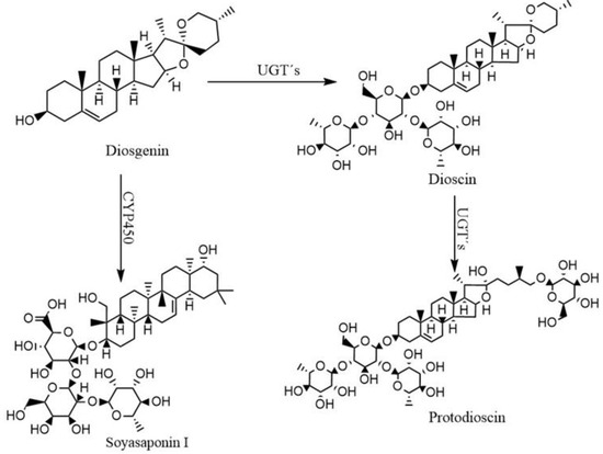 These compounds have demonstrated a wide range of biological activities, including hemolytic, molluscicidal, anti-inflammatory, antiparasitic, antitumor, analgesic, antifungal, antibacterial, antiviral, allelopathic, and insecticidal properties [4,5,6,7,8,9,10,11,12]. Saponins are also important in the pharmaceutical industry as precursors for the synthesis of steroid hormone drugs [6,13]. Among these, diosgenin, a steroidal saponin, is particularly notable for its use in producing bioactive compounds with various therapeutic applications [14].