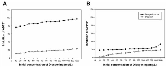 Antioxidant activity was measured by the ABTS· and DPPH· free radical scavenging methods. The ABTS· radical elimination test was conducted with a solution of 7 mM of ABTS· and 2.45 mM of a potassium persulfate solution. These solutions were mixed in equal parts and kept in the dark at room temperature for 12 to 16 h to form the ABTS· radical. After 12 to 16 h, the ABTS· solution was diluted in ethanol to absorb 0.8 (±0.02) at 734 nm, and the blank used was ethanol. For sample analysis, 100 μL of the extract mixture was taken at different initial diosgenin concentrations, and 1.9 mL of the ABTS· radical solution was added [22]. The percentage of inhibition of the ABTS· radical for the extract mixtures was evaluated using Equation (1) [71]: