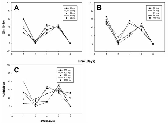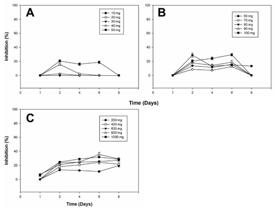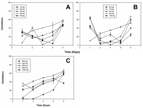 Inhibition of Aspergillus niger Growth by Bioconverted Diosgenin Extracts. The graph illustrates the percentage inhibition of Aspergillus niger growth by extracts obtained from the bioconversion of diosgenin at varying initial concentrations: (A) from 10 to 50 mg; (B) from 60 to 100 mg; (C) from 200 to 1000 mg. Although the inhibition observed was lower than that of other fungi, significant antifungal effects were still noted, particularly at mid-range concentrations. This moderate inhibitory effect highlights the differential sensitivity of fungal species to the bioconverted extracts. The controls included untreated cultures and cultures treated with unmodified diosgenin (not included in the figure because it did not affect the fungal strains). The results reinforce the importance of optimizing extract concentrations for targeted antifungal applications.