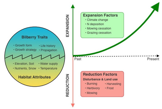 At subalpine and alpine belts, climate warming is likely to lead to milder winters and/or earlier springs. Warmer winters can cause premature snowmelt, leading to early dehardening in plants or the prevention of rehardening, especially if diurnal temperatures are already high. In the 1990s, even dieback occurrence was predicted for bilberry [30,31]. Delayed metabolic activity, retarded bud burst, and reduced stem elongation in bilberry plants were anticipated as consequences of climate warming [32]. However, we now observe the expansion of shrubs, including bilberry, in forest, alpine, and tundra habitats worldwide. The following text summarizes the most important prerequisites for the spread of blueberry and its consequences.