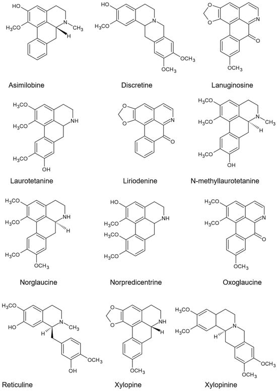 - Lúcio, A.S.S.C.; Almeida, J.R.G.d.S.; Da-Cunha, E.V.L.; Tavares, J.F.; Barbosa Filho, J.M. Alkaloids of the Annonaceae: Occurrence and a Compilation of Their Biological Activities. Alkaloids Chem. Biol. 2015, 74, 233–409. [Google Scholar] [CrossRef]
