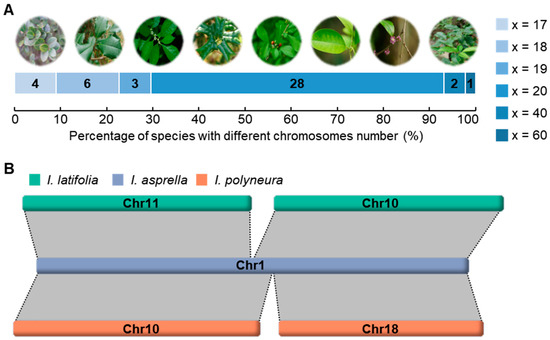 Chromosome number in Ilex and chromosome fusion in I. asprella. (A) Statistics of the chromosome number in representative species of Ilex. The photos from left to right indicate I. crenata Thunb. (x = 17), I. opaca Aiton and I. verticillata (L.) A. Gray (x = 18), I. cornuta Lindl. & Paxton (x = 19), I. decidua Walter, I. godajam (Colebr.) Wall. ex Hook.f. and I. pubescens Hook. & Arn. (x = 20), and I. pedunculosa (x = 60). (B) Collinearity plot showing the fusion of Chr1 in I. asprella.