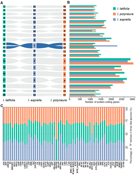 Comparative genomic analyses in three Ilex species. (A) Collinearity analysis in I. latifolia, I. polyneura, and I. asprella. The chromosome fusion in I. asprella is highlighted in blue. (B) The number of annotated protein-coding genes in corresponding chromosomes of I. latifolia, I. polyneura, and I. asprella. (C) Statistics of 58 transcription factor families in three Ilex species. Percentages in I. latifolia, I. polyneura, and I. asprella are marked in green, orange, and blue, respectively.