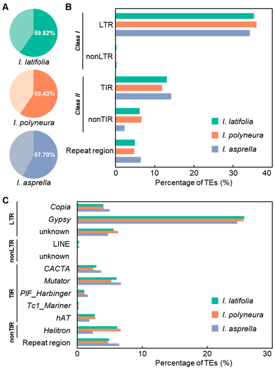 Identification of TEs in three Ilex genomes. (A) Pie charts showing the total proportion of TEs in the genomes of I. latifolia, I. polyneura, and I. asprella. (B,C) Bar charts showing the proportion of TEs belonging to Class I, Class II (B), and each superfamily (C) in the three genomes.