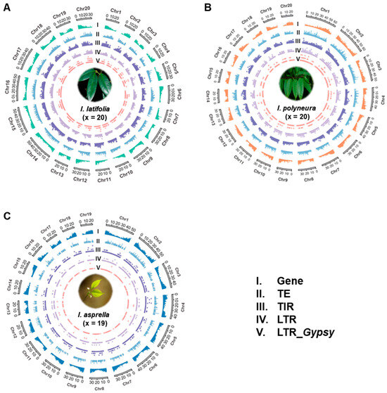 Distribution of protein-coding genes and TEs in genomes of three Ilex species. (A–C) Three circular plots represent the densities of distinct genomic features in I. latifolia (A), I. polyneura (B), and I. asprella (C). Layers of circular plots from outside to inside indicate (I) gene, (II) transposable elements, (III) terminal inverted repeat, (IV) long terminal repeat, and (V) LTR_Gypsy. The ideogram scale is in Mbp.