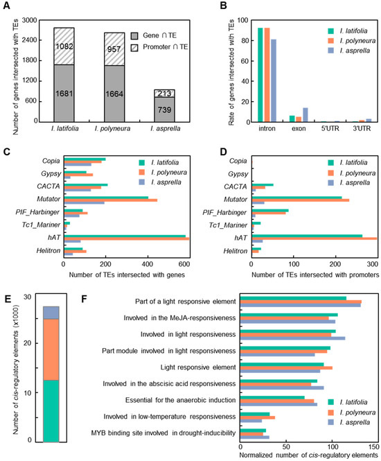 Our findings on the cis-regulatory elements within TEs that intersect with promoters identified substantial differences among the three species. I. latifolia and I. polyneura had a significantly higher number of cis-regulatory elements associated with TEs compared to I. asprella, suggesting different evolutionary pressures and functional significances. Elements related to light responsiveness, MeJA responsiveness, abscisic acid responsiveness, low-temperature responsiveness, and drought stress were significantly enriched, underscoring the critical role of TE insertions in plant defense mechanisms, hormone responses, and stress responses.