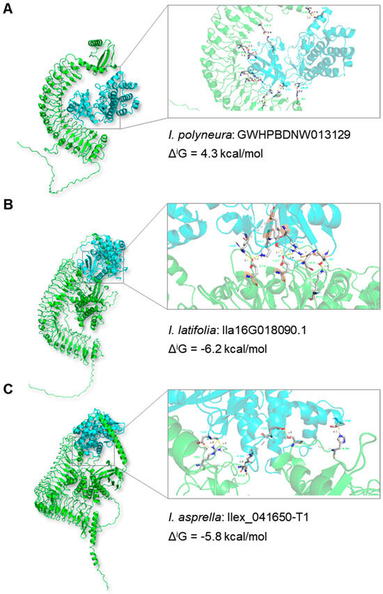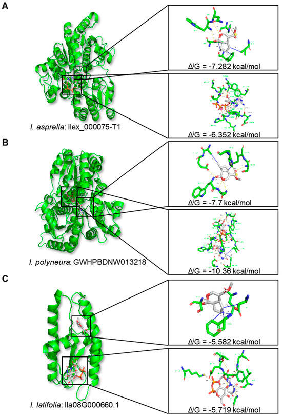 We further calculated the binding free energy at the interface, denoted as ΔiG (kcal/mol), to assess the molecular docking capacity between the 7-deoxyloganetin glucosyltransferase and the two ligands. Our findings showed that the ΔiG at the interface between Ilex_000075-T1 and 7-deoxyloganetin was −7.282 kcal/mol, and between Ilex_000075-T1 and UDP-alpha-D-glucose in I. asprella was −6.352 kcal/mol (Figure 6A and Table S9). The ΔiG at the interface between GWHPBDNW013218 and 7−deoxyloganetin was −7.7 kcal/mol, and between GWHPBDNW013218 and UDP−alpha−D-glucose in I. polyneura was −10.36 kcal/mol (Figure 6B and Table S9). However, the ΔiG at the interface between Ila08G000660.1 and 7-deoxyloganetin was −5.582 kcal/mol, and between Ila08G000660.1 and UDP−alpha−D−glucose in I. latifolia was −5.719 kcal/mol (Figure 6C and Table S9). Given the inverse relationship between docking capacity and the ΔiG value, our data suggested that the binding ability of Ila08G000660.1 in I. latifolia was disrupted by insertion of the Gypsy superfamily.