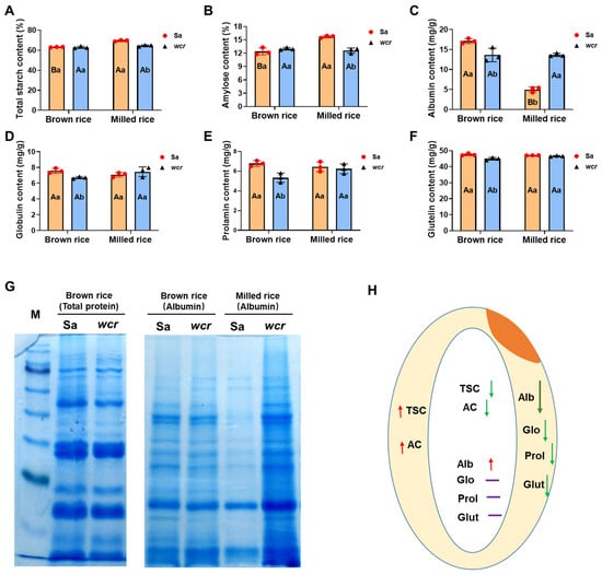 Physicochemical properties of mature grains of Sa and wcr mutant. (A–F) The contents of total starch, amylose, albumin, globulin, prolamin, and glutelin in brown rice flour and milled rice flour of Sa and wcr mutant. Different small case letters denote statistical differences between Sa (orange) and wcr (blue) plants in the same rice type (brown or milled); different upper case letters denote statistical differences between brown or milled rice types in the same wild type or wcr plants. (G) The SDS-PAGE analysis of storage proteins of Sa and wcr mutant rice flour. (H) Changes in the contents of storage substances in the inner and outer endosperm of wcr compared to wild type (the yellow part indicates the outer endosperm; the white part indicates the inner endosperm; Red arrows represent up-regulated levels, light green and dark green arrows represent down-regulated levels, and purple horizontal lines indicate unchanged levels; TSC, total starch content; AC, amylose content; Alb, albumin; Glo, globulin; Prol, prolamin; Glut, glutelin).