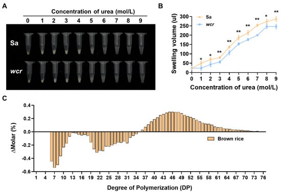 Although the total starch content and amylose content in the brown rice flour of the mutant did not show significant differences compared to those of the wild type (Figure 2A,B), results from starch gelatinization tests using varying concentrations of urea solution revealed that the wcr mutant exhibited reduced solubility in urea. As shown in Figure 3A,B, the swelling volume of the mutant’s brown rice flour was smaller than that of the wild-type under different urea concentrations, with a noticeable difference observed at a concentration of 1 mol/L (Figure 3B). At a urea concentration of 8 mol/L, no expansion was observed for the mutant while it continued for the wild type (Figure 3A,B). Furthermore, the analysis of the amylopectin chain length distribution revealed a reduction in the content of chain lengths ranging from 6 to 35 in the degree of polymerization (DP) in the brown rice flour of the wcr mutant, while an increase was observed in the chain lengths greater than 36 DP (Figure 3C).