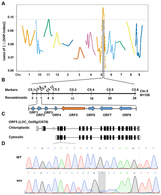 Fine mapping of the wcr gene. (A) The MutMap analysis of the wcr gene. (B) Fine mapping of the wcr gene using linkage analysis. (C) The gene structure of the LOC_Os05g33570. (D) The Sanger chromatogram of the WT and wcr.