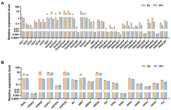 Gene expression analysis of storage substance-related genes of Sa and the wcr mutant. (A) Gene expression analysis of grain protein biosynthesis genes. (B) Gene expression analysis of grain starch metabolism genes.