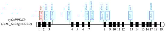 Through gene mapping and sequencing comparison, it has been determined that the wcr mutant is governed by a pair of recessive nuclear genes encoding pyruvate phosphate dikinase OsPPDKB. A comprehensive literature search has identified a total of nine distinct allelic mutant genes for OsPPDKB, including knockout mutations (flo4-1 [24], flo4-2 [24], flo4-3 [24], and flo4-303 [63]) and missense mutations (flo4-4 [64], flo4-5 [65], flo4-6 [66], M14 [67], and floTR1 [68]) (Figure 6). The wcr mutation in this study was caused by an additional C base insertion in the second exon of cyOsPPDKB, resulting in a frameshift mutation. Therefore, the wcr can be considered as a novel allelic gene variant of cyOsPPDKB. Although there have been some changes in the crop traits of wcr, such as increased plant height and reduced tillering, which differ from previous studies, it should be noted that the wcr mutant originated from plant tissue culture, where stable heritable variations were likely generated during the process.