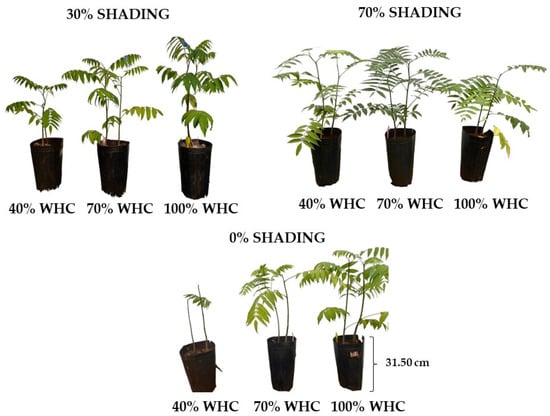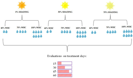 After transplanting, seedlings were submitted to acclimatization for 45 days at each shading level—SH (0, 30, and 70%). After this period, seedlings were submitted to three water regimes based on the water holding capacity (WHC) in the substrate, constituting nine cultivation conditions: T1—0% SH + 40% WHC; T2—0% SH + 70% WHC; T3—0% SH + 100% WHC; T4—30% SH + 40% WHC; T5—30% SH + 70% WHC; T6—30% SH + 100% WHC; T7—70% SH + 40% WHC; T8—70% SH + 70% WHC; T9—70% SH + 100% WHC. The experimental design used was completely randomized in a factorial scheme with 9 cultivation conditions (WHC and shading combination) × 4 evaluation times, with four replicates (Figure 6). The experimental unit consisted of one pot with two seedlings each. These different light gradients and water regimes were chosen based on results obtained in previous work [6,18], where tree species were responsive.