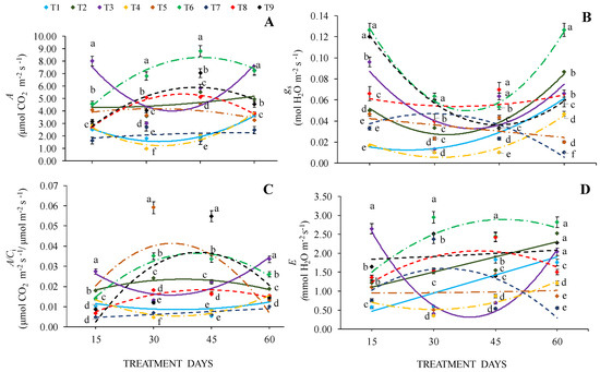 Net photosynthetic rate—A (A), stomatal conductance—gs (B), Rubisco carboxylation efficiencies—A/Ci (C), and transpiration rate—E (D) of Cedrela fissilis Vell. seedlings evaluated at 15, 30, 45, and 60 treatment days under different water and light availability. T1—0% SH + 40% WHC; T2—0% SH + 70% WHC; T3—0% SH + 100% WHC; T4—30% SH + 40% WHC; T5—30% SH + 70% WHC; T6—30% SH + 100% WHC; T7—70% SH + 40% WHC; T8—70% SH + 70% WHC; T9—70% SH + 100% WHC. SH—shading and WHC—water holding capacity. Equal lowercase letters between markers of different colors in each evaluation period do not differ statistically by the Scott-Knott test (p ≤ 0.05) ± standard error for cultivation conditions.