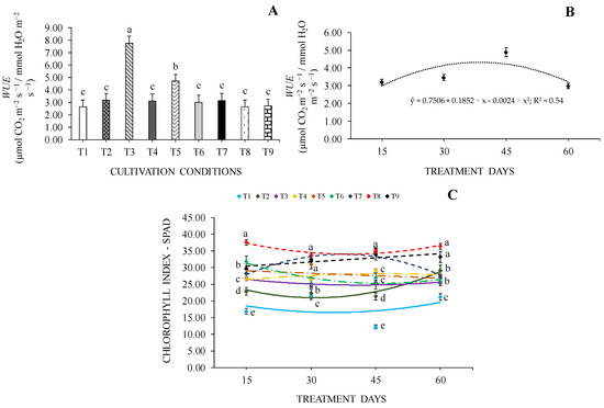 Water use efficiency—WUE (A,B) and chlorophyll index—SPAD (C) of Cedrela fissilis Vell. under different availability of water and light evaluated at 15, 30, 45 and 60 treatment days. T1—0% SH + 40% WHC; T2—0% SH + 70% WHC; T3—0% SH + 100% WHC; T4—30% SH + 40% WHC; T5—30% SH + 70% WHC; T6—30% SH + 100% WHC; T7—70% SH + 40% WHC; T8—70% SH +70% WHC; T9—70% SH + 100% WHC. SH—shading and WHC—water holding capacity. Equal lowercase letters between columns or markers of different colors in each evaluation period do not differ statistically according to the Scott-Knott test (p ≤ 0.05) ± standard error for cultivation conditions.