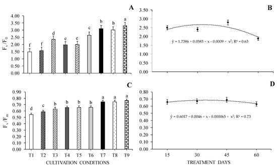 Effective quantum yield of photochemical energy conversion in PSII—Fv/F0 (A,B) and potential quantum efficiency of PSII—Fv/Fm (C,D) of Cedrela fissilis Vell. under different availability of water and light evaluated at 15, 30, 45, and 60 treatment days. T1—0% SH + 40% WHC; T2—0% SH + 70% WHC; T3—0% SH + 100% WHC; T4—30% SH + 40% WHC; T5—30% SH + 70% WHC; T6—30% SH + 100% WHC; T7—70% SH + 40% WHC; T8—70% SH +70% WHC; T9—70% SH + 100% WHC. SH—shading and WHC—water holding capacity. Equal lowercase letters between columns in each evaluation period do not differ statistically according to the Scott-Knott test (p ≤ 0.05) ± standard error for cultivation conditions.