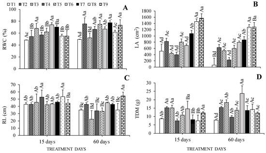 Relative water content of leaves—RWC (A), leaf area—LA (B), root length—RL (C), and total dry mass—TDM (D) of Cedrela fissilis Vell. under different availability of water and light evaluated at 15 and 60 treatment days. T1—0% SH + 40% WHC; T2—0% SH + 70% WHC; T3—0% SH + 100% WHC; T4—30% SH + 40% WHC; T5—30% SH + 70% WHC; T6—30% SH + 100% WHC; T7—70% SH + 40% WHC; T8—70% SH + 70% WHC; T9—70% SH + 100% WHC. SH—shading and WHC—water holding capacity. Lowercase letters compare the effect of cultivation conditions at each evaluation time using the Scott-Knott test (p ≤ 0.05), and uppercase letters compare the effect of days of cultivation within each cultivation condition using the F test (p ≤ 0.05) ± standard error.