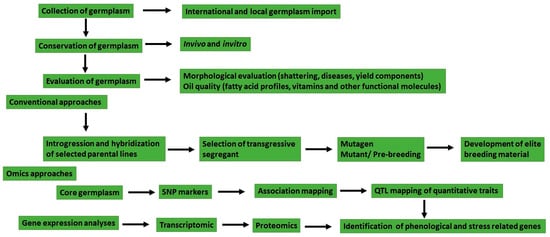 Transcriptomic profiling of sesame genes revealed 57 MADS-box genes across 14 linkage groups that are essential for sesame development and growth [7]. Structural analysis and functional differences among MADS-box genes showed similarities and differences with model species Arabidopsis thaliana and Solanum lycopersicum [7]. The MIKCC-type MADS-box genes are also shown related to sesame flower initiation and seed development [7]. Transcriptomic analysis of interspecific hybrids has also identified genes related to disease resistance [18]. Studies of 4.4 Mbps related to fatty acid metabolism show genetic diversity loss during the domestication of sesame [19]. Expression profiles of traits such as capsule, seed leaf, and root development in cultivar “Zhongzhi13”, as well as the transcriptomic profile of genes related to waterlogging tolerance in “ZZM2541” and oil content in high-oil-yielding cultivar “Zhongfengzhi1”, were investigated [7]. Candidate genes related to seed yield, lipid metabolism, phenological traits, or disease resistance are available in the database [7]. Hence, wild and cultivated accessions should be further evaluated and characterized for morphological, agronomical, and molecular traits and consequently used as parental material to develop pre-breeding lines or improved sesame genotypes with high yield, disease resistance, and quality traits. A comprehensive summary illustrating the concepts discussed in the text on sesame breeding and conservation is illustrated in Figure 1 below.